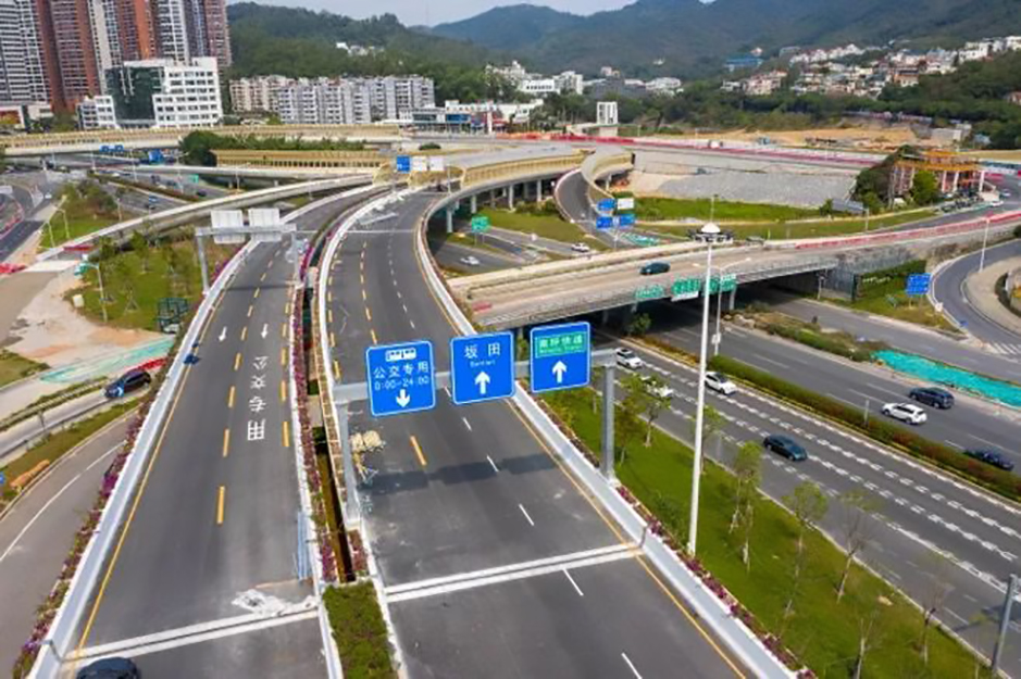 坂银通道规划定位为城市干线主干道,为双向六车道设计。项目起始于泥岗立交,向北沿北环大道西侧高架布设,上跨北环大道后穿越金湖调蓄湖,以隧道形式进入鸡公山,出隧道后跨南坪快速,北接坂雪岗大道。道路长约 8.45 公里,全线设特长隧道 1 座、互通式立交 4 座,由南往北分别是泥岗立交、北环立交、南坪立交及环城立交。是连接深圳市中心组团和中部综合组团,主要承担坂田与中心区(上步、华强)以及罗湖之间中长距离交通需求。