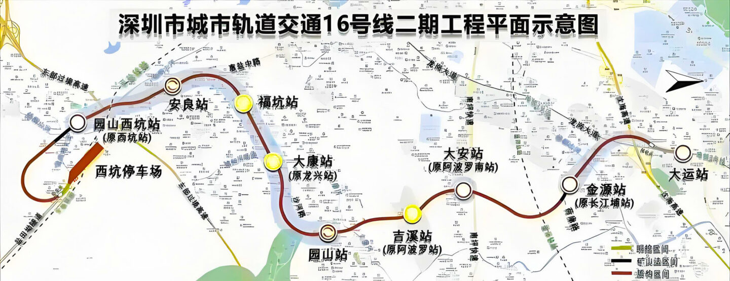 暨深圳地铁16号线(2022年12月28日开通运营)一期工程(大运站至田心站)后,深圳地铁16号线二期工程也于2025年9月28日开通运营(大运站至园山西坑站),其标志色为靛青色。二期线路自大运站向南延伸经龙岗园山街道,终至盐田方向园山西坑站,全长约9.54公里,采用全地下敷设,沿线共设金源、吉溪、大安、园山、大康、福坑、安良、园山西坑8座地下车站。