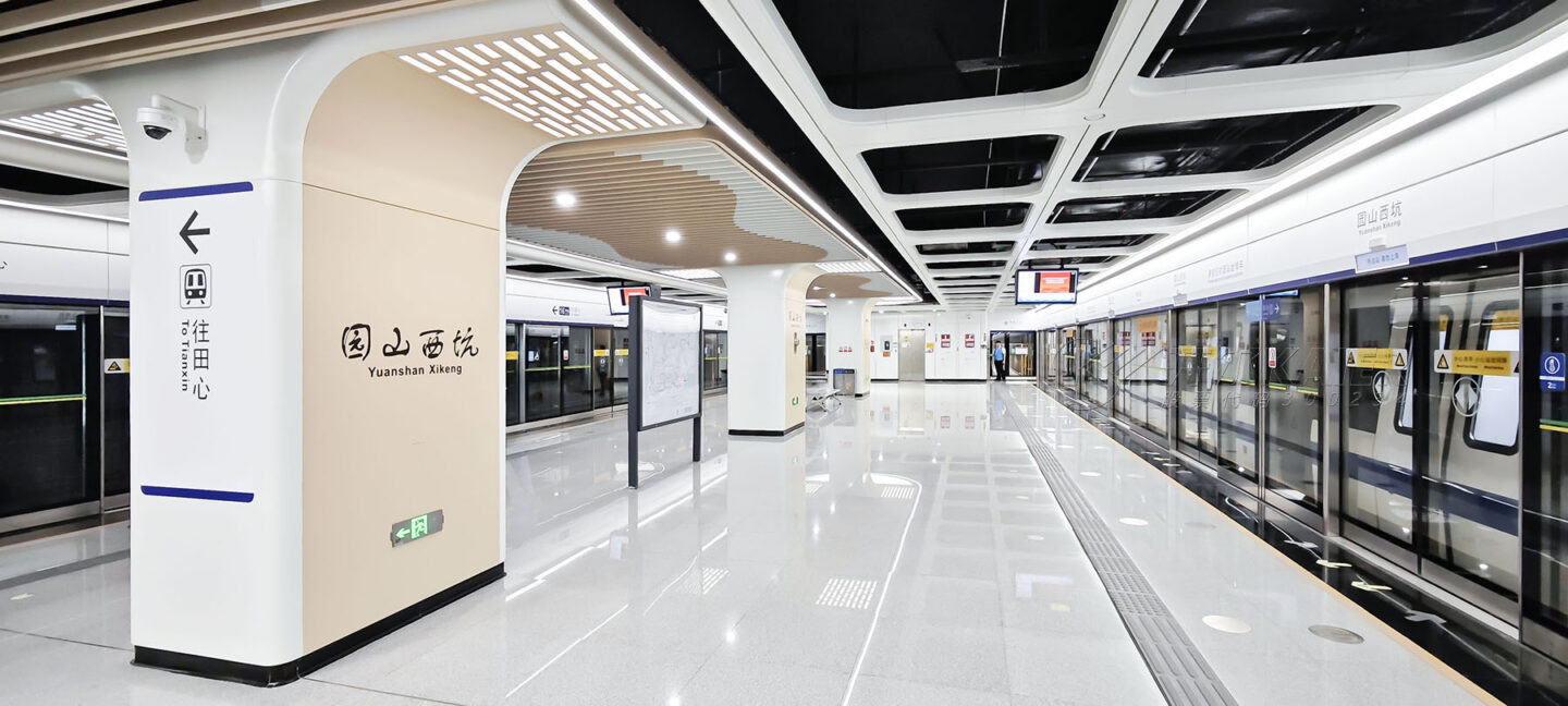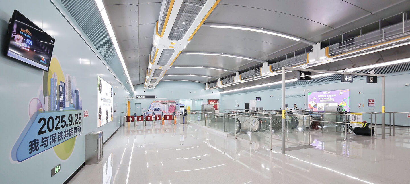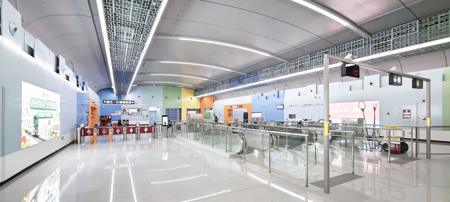 深圳地铁16号线二期工程标准站设计延续16号线“阳光+新家园线”主题,提炼客家围屋、半月池等传统元素,并通过灯光与色彩的现代表达,营造深圳人对“家”的空间情绪,装修风格呈现“世居、客居、新居”三大特色。