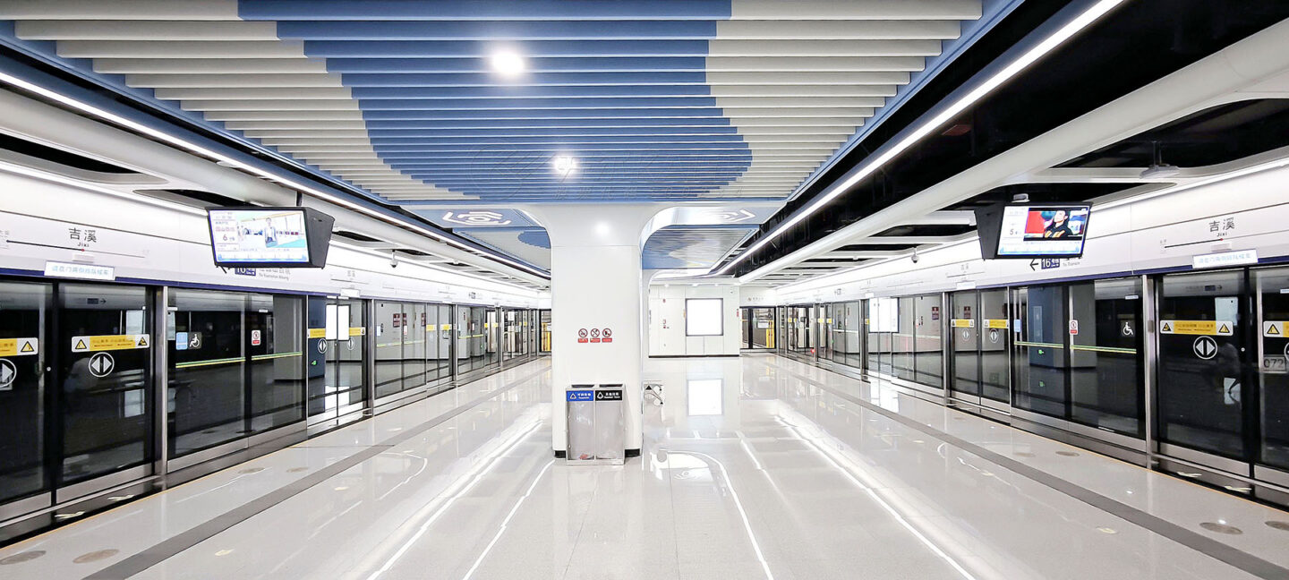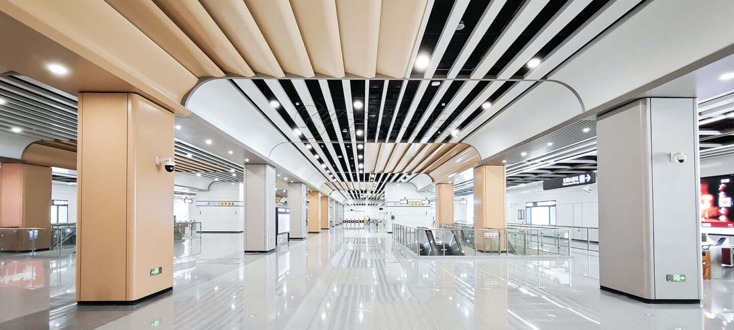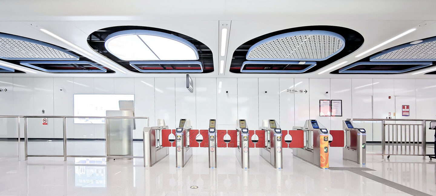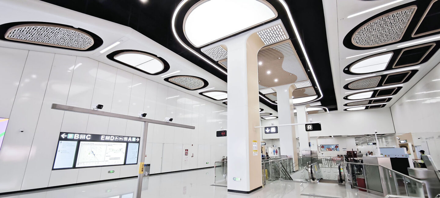 深圳地铁16号线二期工程标准站设计延续16号线“阳光+新家园线”主题,提炼客家围屋、半月池等传统元素,并通过灯光与色彩的现代表达,营造深圳人对“家”的空间情绪,装修风格呈现“世居、客居、新居”三大特色。